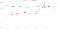 Esse gráfico mostra as notas obtidas na primeira vez que fiz cada teste do simulado (linha vermelha) e na segunda vez (linha azul), nota-se que há uma evolução no aprendizado.